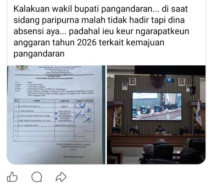 Pangandaran, global aktual – Polemik kehadiran pejabat kembali mencuat di Kabupaten Pangandaran setelah publik menyoroti absennya Wakil Bupati dalam Sidang Paripurna Penetapan Persetujuan DPRD terhadap Rancangan Perda APBD Tahun Anggaran 2026, pada Kamis 27 November 2025, pukul 13:30 WIB. Sorotan semakin tajam setelah beredar foto daftar hadir yang menunjukkan tanda tangan Wakil Bupati tercantum, namun ia tidak terlihat mengikuti jalannya sidang.